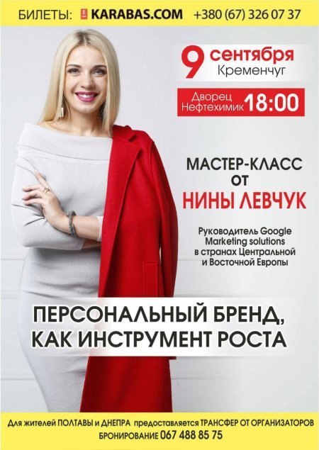 Нина Левчук -руководитель Google Marketing Solution в Центральной и Восточной Европе, спикер, писатель, коучер, консультант по карьере, участница рейтинга “50 самых влиятельных женщин Украины 2017 года” по версии журнала “Бизнес” - победитель в номинации "Карьера года" Cosmopolitan Awards 2018 -участница Ironman and Oceanman -за плечами 10+ лет опыта работы в топовых международных компаниях и стартапах Кремневой долины - 5+ лет опыта в менторинге (наставничестве) для руководителей -сертифицированный коучер по карьерному росту и развивает направление менторинга в Украине и Европе