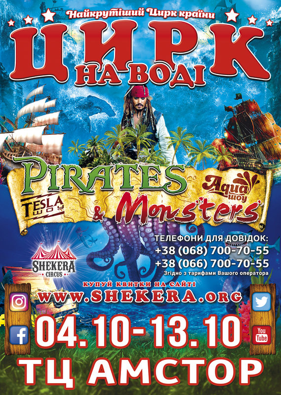 А ви готові сісти на корабель, який захватять справжнісінькі пірати? Готові побачити величезного восьминога з шестиметровими щупальцями, а потім потрапити у підводне царство та познайомитися з його неймовірними мешканцями? Якщо так, тоді вам до цирку на воді «Shekera».Тільки у новій програмі «Pirates & Monsters» ви зможете побачити, як пірати-батутисти захоплять корабель та відправлять його у морські глибини.Разом з екіпажем піратської шхуни ви зустрінетеся з фокусниками та жонглерами, побачите, як повітряні гімнасти перетворяться на неонових рибок, поринете у чарівний світ підводного царства.На глядачів чекає справжня підводна феєрія, фаер-шоу, неймовірні молнії Мега Тесла-шоу та неонове різнобарв’я.Стережіться, у програмі «Pirates & Monsters» ховається величезна медуза з двометровими щупальцями-молніями.