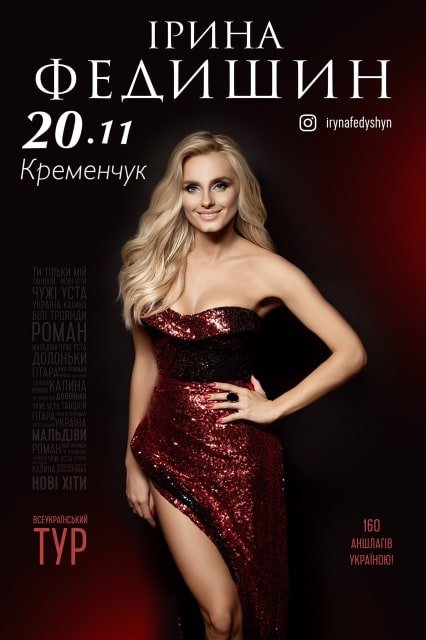 Зустрічайте в Кременчуці великий концерт - шоу Ірини Федишин, з фантастичними постановками номерів. Ірина виконає найулюбленіші пісні.