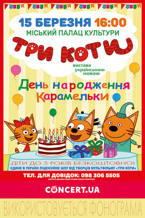 15 березня 2020 в 16:00 в міському палаці культури дитяча вистава "Три коти - день народження карамельки".