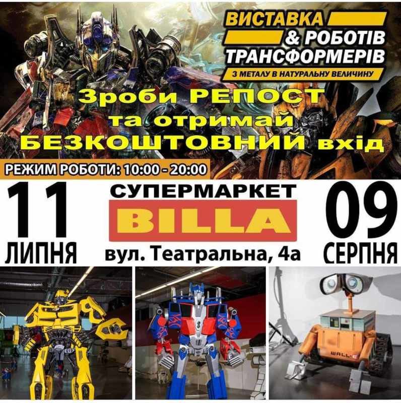 Вперше в Кременчуці відбудеться виставка металевих роботів та трансформерів у справжню величину. Вони дивують своєю натуральністю: такі великі та страхітливі, лякаючі, як тільки зійшли з екранів телевізорів. Роботи-трансформери - персонажи відомих мультфільмів та фантастичних фільмів.