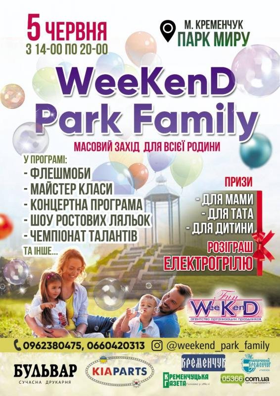 5 червня 2021 з 14:00 до 20:00 у парку Миру в Кременчуці пройде масовий захід для всієї родини Weekend Park Family.