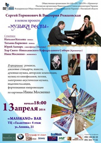 В программе: романсы, джазовые стандарты, ретро, духовная музыка, авторские композиции, поэзия, фортепианные импровизации по картинам Инны Мосиенко, видеоинсталляции...
