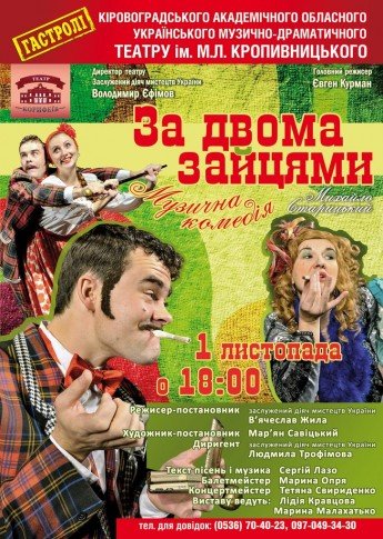 «За двома зайцями » — музична комедія класика української драматургії Михайла Старицького не втрачає своєї актуальності і сьогодні. Історія про веселого авантюриста Свирида Голохвостого насичена сучасною популярною музикою та акторськими трюками.