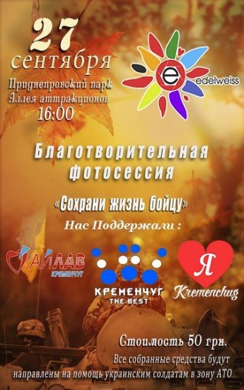 Осень - это прекрасное время: разноцветные листья, поздние цветы, солнечные деньки! Стоит запечатлеть лучшие моменты осени на фотографиях! Приходите на благотворительную фотосессию, организованную в поддержку нашим солдатам. Мы приглашаем всех желающих поучаствовать в акции!
