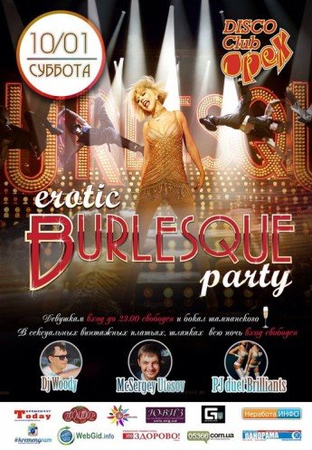 Вечер феерии, заводной музыки, ярких красок, бeзудерженого веселья и эффектных гостей в ярких, соблазнительных костюмах, перенесет нас в мир бурлеска – шика ,веселья и красоты!