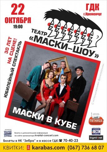 В этом году колектив «Маски-шоу» празднует свой юбилей - 30 лет на сцене! За этот период они стали настояними любимцами народа . Программа спектакля «Маски в кубе» будет показана впервые. Она обещает одесские мотивы и отборные шутки. Зрители смогут посмотреть на мир другими глазами, найти себя в героях, а героев в себе…Также в шоу будут пантомимы, давно полюбившиеся всем от мала до велика: «Танец умирающего лебедя», «Танец самовара и чашек», «Маски в опере».