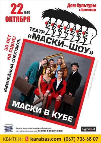 «Главная идея постановки в том, что мы все стремимся получить свободу, - говорит режиссер театра Георгий Делиев, но очень часто становимся рабами своих же стереотипов. «Маски в кубе» рушит все границы восприятия, каждый может увидеть здесь что-то свое и о себе, наша задача создавать такое, что в принципе невозможно объяснить словами». Спектакль "Маски в кубе" основан на новых номерах и режиссерских идеях, начиная от комедийных трюков и заканчивая декорациями на сцене. Однако, в шоу войдут и полюбившиеся зрителю пантомимы «Масок», такие как культовый "Вокальный дуэт Мана-мана-тынч-тынч-тытырым", который впервые появился на телевидении в 1985 году, "Танец умирающего лебедя" и "Танец самовара и чашек" из "Маски в опере". В спектакле принимают участие: Народный артист Украины Георгий Делиев, Народный артист Украины Борис Барский, Заслуженная артистка Украины Наталья Бузько, Александр Постоленко, Игорь Малахов, Михаил Волошин и др.