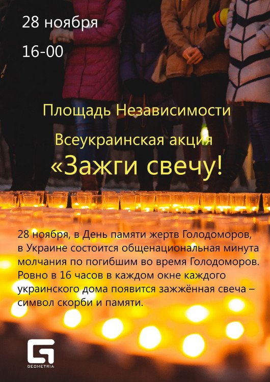 В День памяти жертв Голодоморов, в Украине состоится общенациональная минута молчания по погибшим во время Голодоморов. Ровно в 16 часов в каждом окне каждого украинского дома появится зажжённая свеча – символ скорби и памяти.