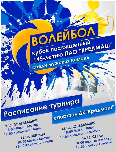 Турнир по волейболу посвященный 145-летию ПАО "КРЕДМАШ" среди мужских команд.