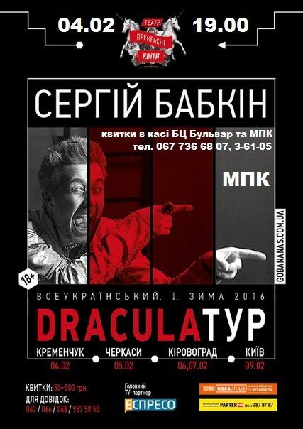 Вистава «DRACULA» - це відкритий анатомічний театр жанрів трилера, гротеску, бойовика, комедії і навіть ліричної драми. У багряному калейдоскопі пристрастей Брема Стокера ви станете свідком фатальної зустрічі Джонатана Харкера і Графа Дракули, його авантюрної подорожі до Лондона в пошуках прекрасної Міни. Зануритесь у світи пристрасті і приреченості Люсі, невиліковного болю Ван Хелсінга та божевілля Ренфілда, знемагаючого в очікуванні свого хазяїна. Пишність легенди без бутафорії прикрас.