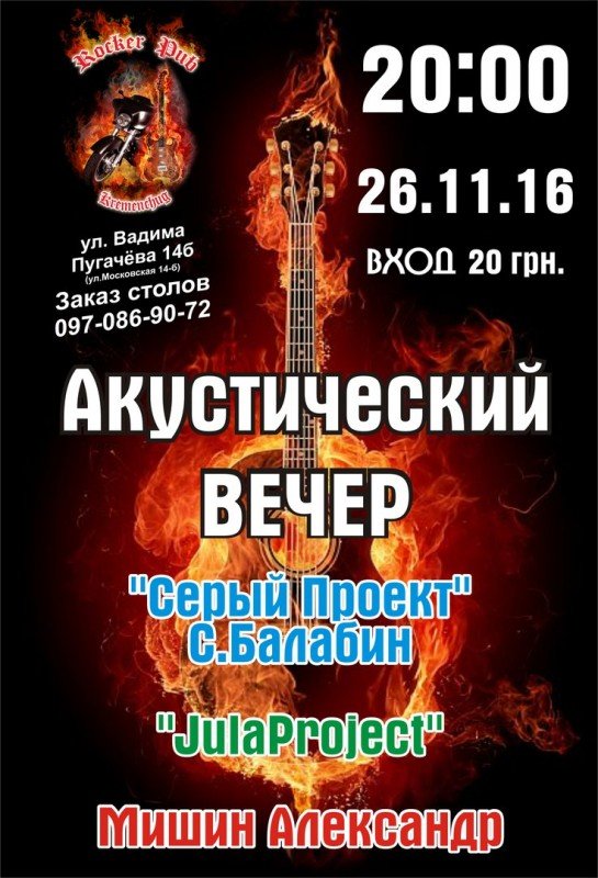 Для вас будут выступать "Серый Проект" С. Балабин "JulaProject" https://vk.com/public126189962 и Мишин Александр.