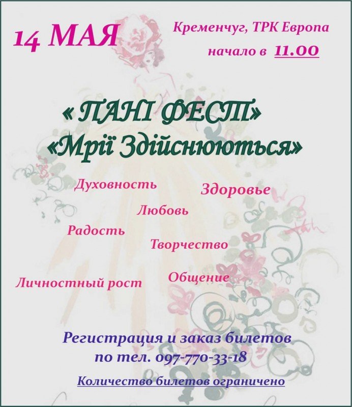 «ПАНІ ФЕСТ» - это уникальная возможность развития для женщин всех возрастов , возможность найти себя и то, что вам по душе, найти новые идеи и возможности для саморазвития и вдохновения.