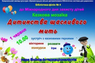 Международный день защиты детей, кременчугские ребятишки отметят свой профессиональный праздник в парке Воинов-Интернационалистов, где для них работники библиотеки-филиала № 4 Кременчугской городской ЦБС для взрослых проведут интересное мероприятие «Дитинства щасливого мить».