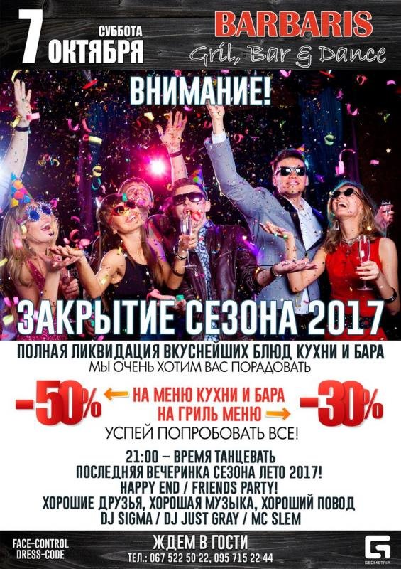 Вечеринка "Закрытие сезона 2017". Полная ликвидация вкуснейших блюд кухни и бара! Успей попробовать все! Хорошие друзья, хорошая музыка, хороший повод!