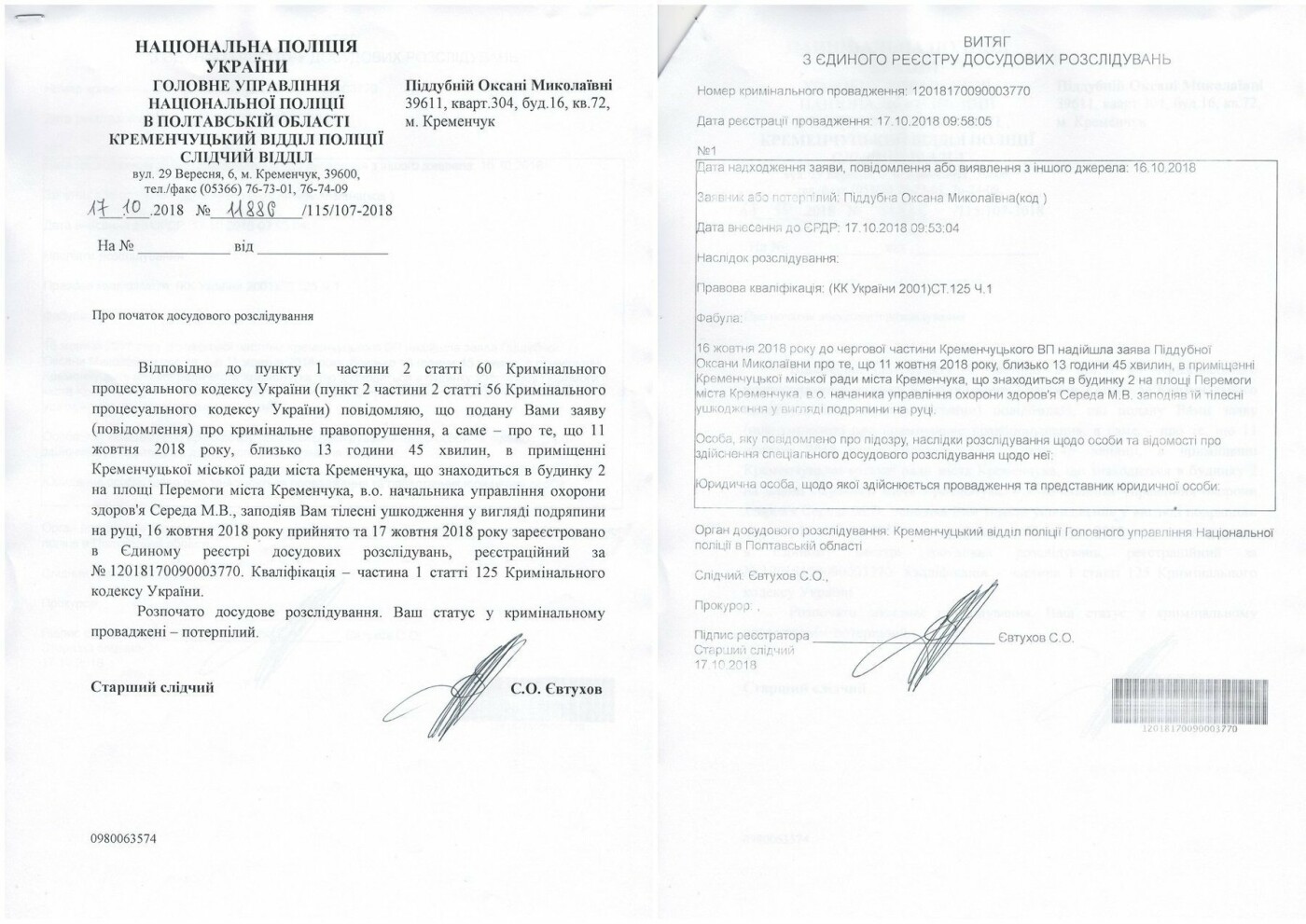 Як повідомляє Піддубна, нею було подано заяву до поліції про відкриття кримінального провадження по факту нанесення легких тілесних ушкоджень Максимом Середою в.о.начальника управління охорони здоров’я м.Кременчука.