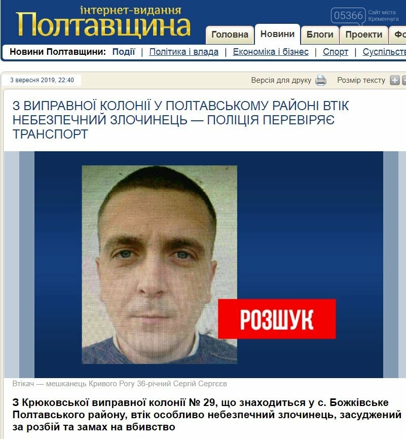 Сьогодні близько першої години ночі поліцейськими Кобеляцького відділу ГУНП Полтавщини із залученням екіпажів поліції охорони в місцевому парку Кобеляк затримано особливо небезпечного злочинця, який вчора втік із виправної колонії, розташованої в Полтавському районі.