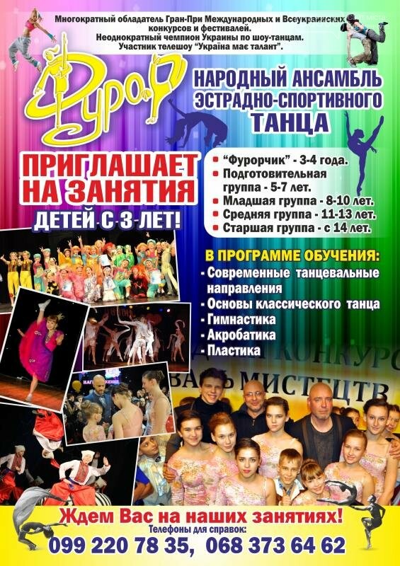 Народный ансамбль эстрадно - спортивного танца "Фурор" Неоднократный победитель всеукраинский и международных конкурсах фестивалях. Обладатель множества Гран- При. Вошедший в 2017 году в сотню лучших коллективов Украины. Приглашает на занятия детей и подростков с 3 лет!!!!!