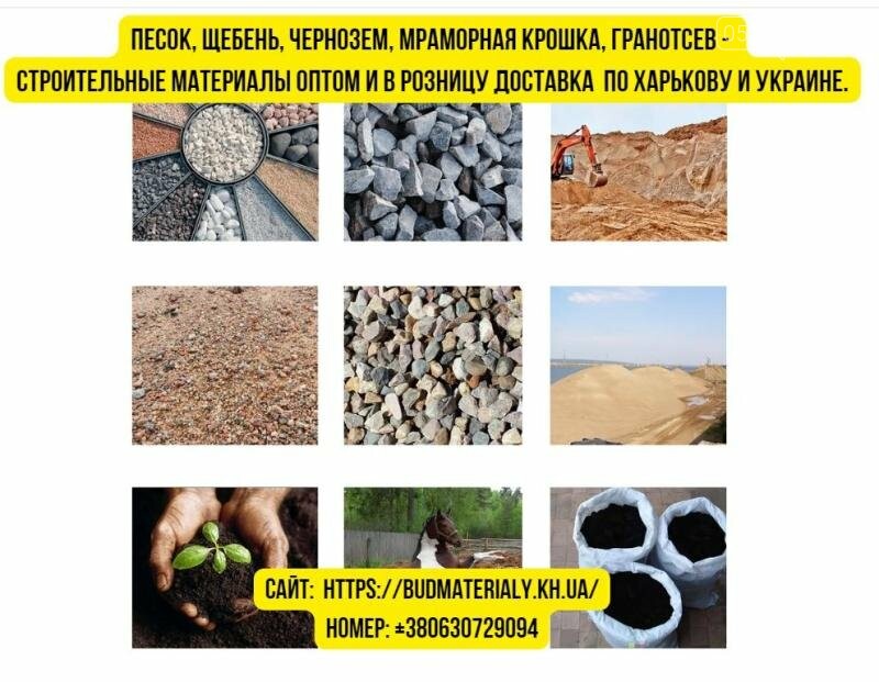 У нас всегда есть в наличии: Щебень и гранотсев в Харькове любого типа и фракции, Песок, Мраморная крошка, Керамзит, Галька, Цемент, Тротуарная плитка, Уголь, Дрова, Бетон, Камень бутовый, Чернозем, Удобрения и многое другое.